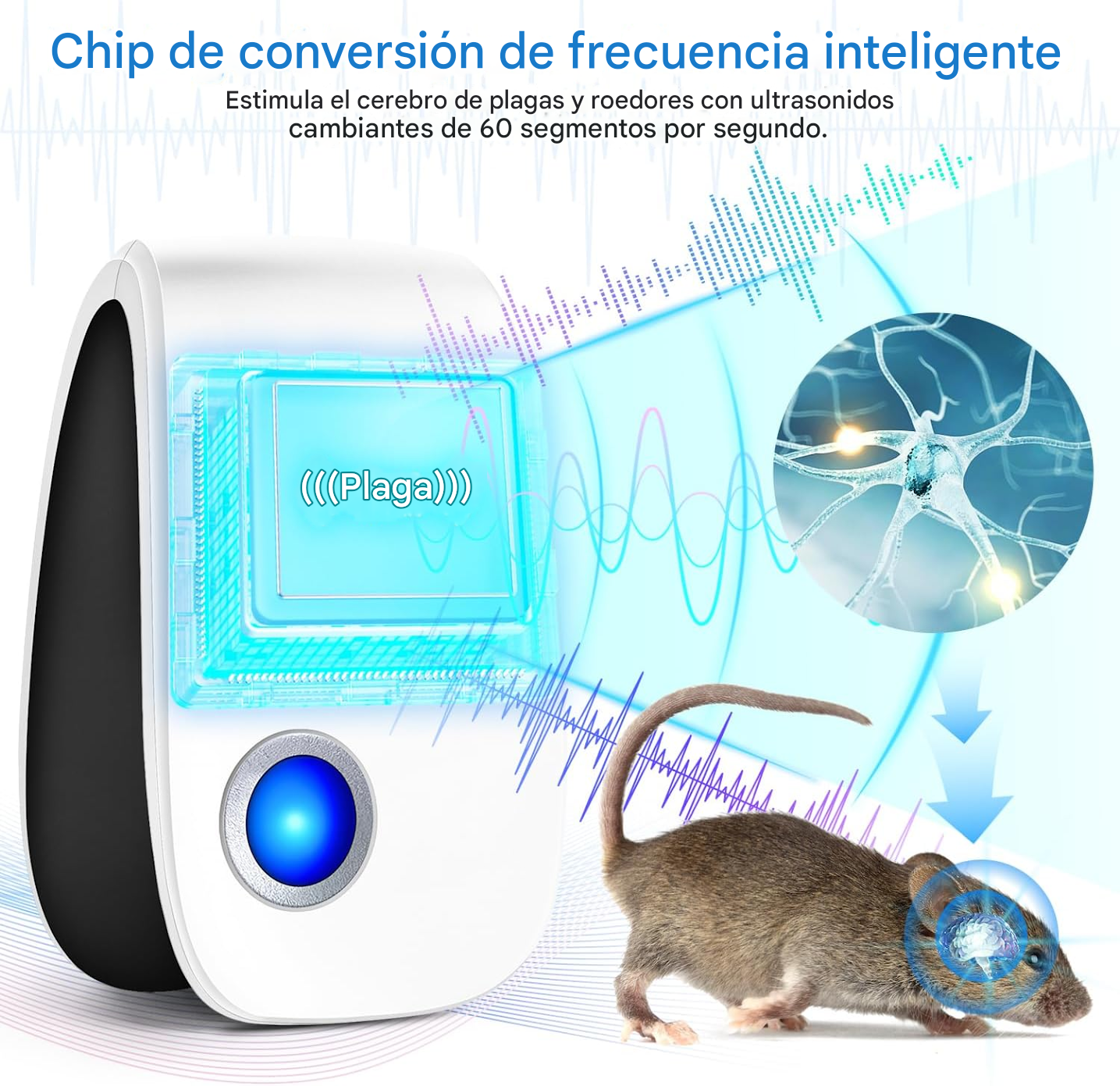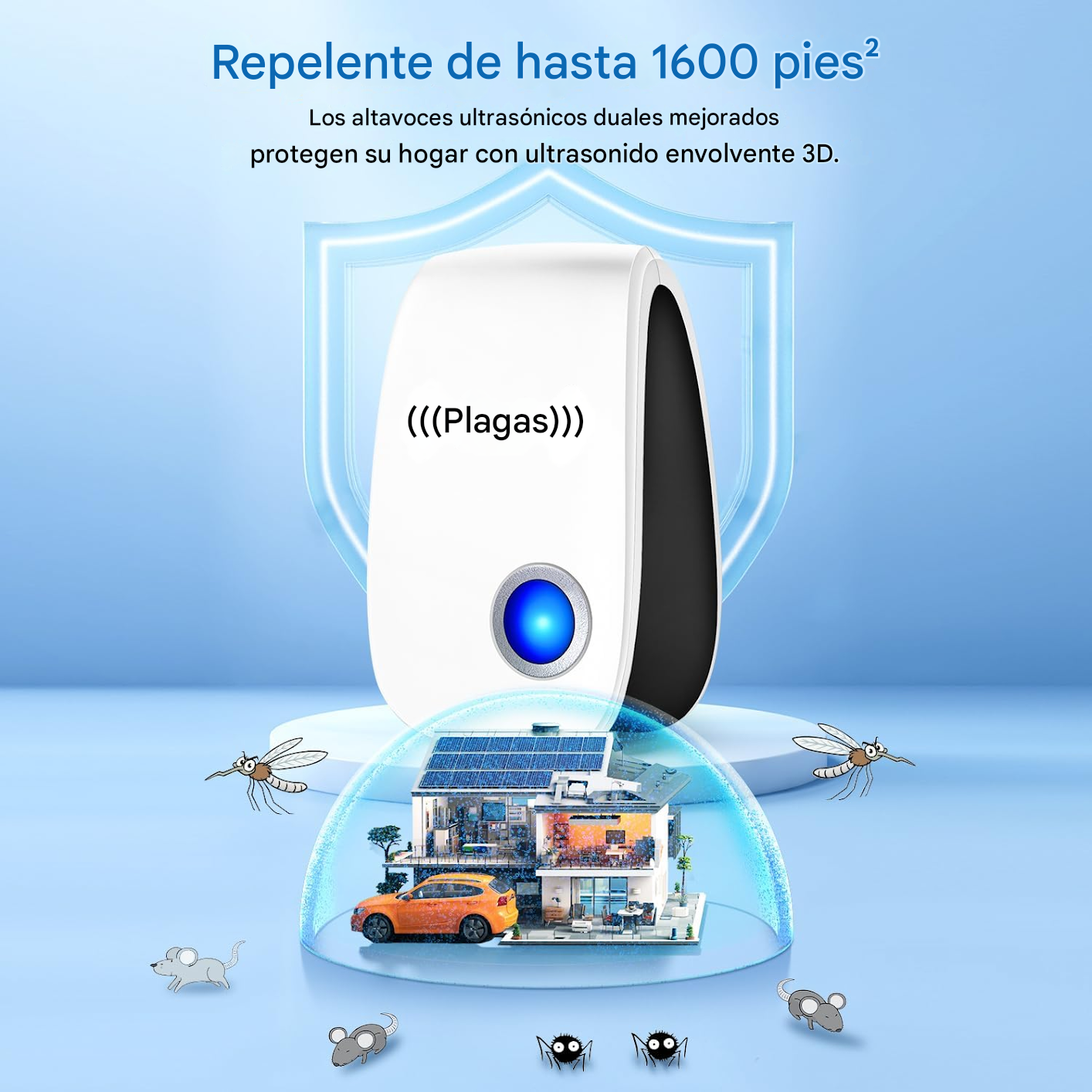 Diseñado con lo último en tecnología repelente, este dispositivo emite ondas ultrasónicas y electromagnéticas que perturban y ahuyentan a las plagas sin dañar a mascotas o humanos.